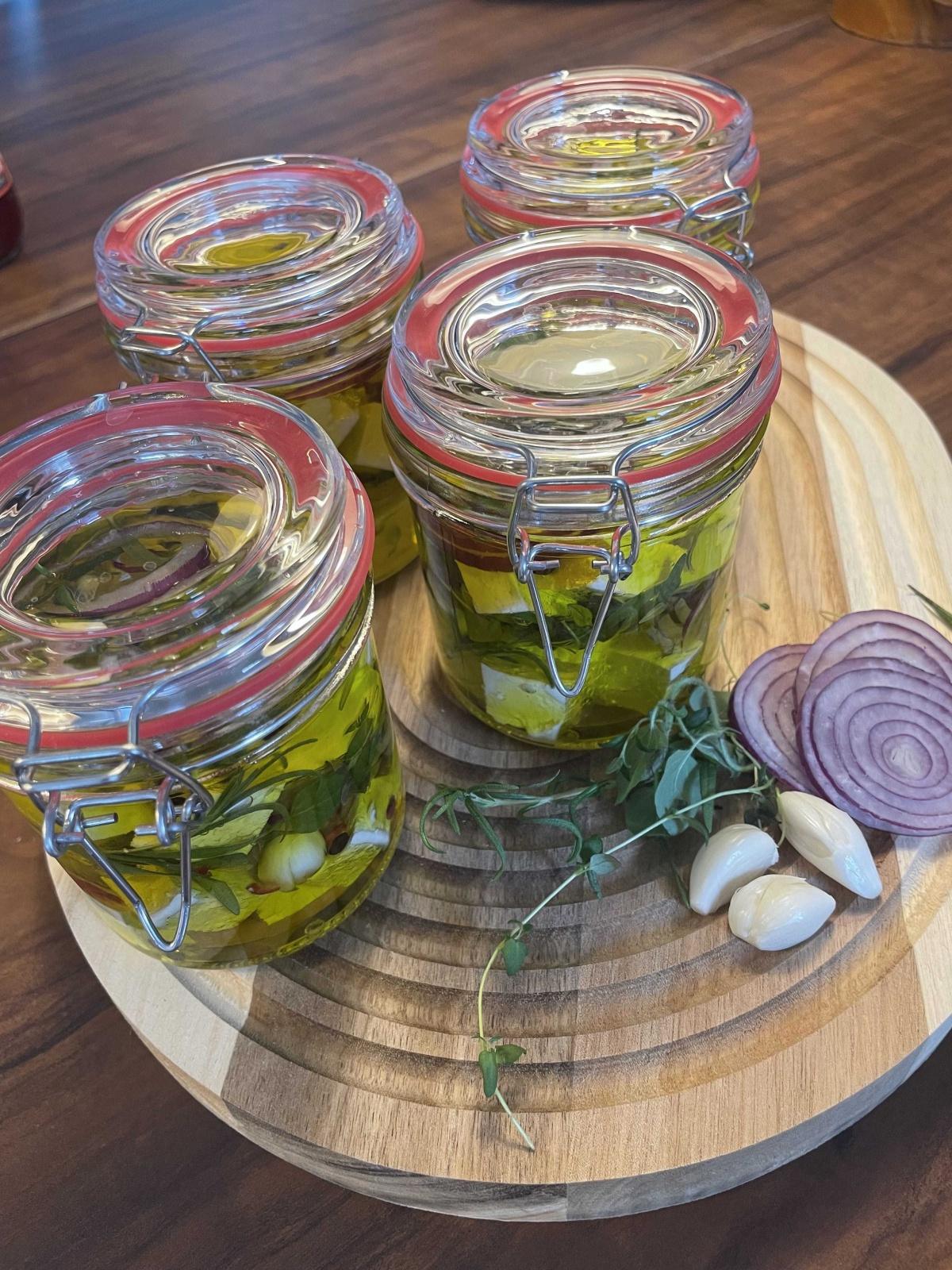 Feta eingelegt mit frischen Kräutern in Olivenöl.